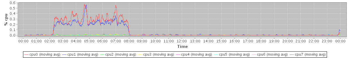 avg(cpu0) = 0.44 avg(cpu1) = 0.49 avg(cpu2) = 0.12 avg(cpu3) = 0.15 avg(cpu4) = 0.10 avg(cpu5) = 0.09 avg(cpu6) = 0.05 avg(cpu7) = 0.07