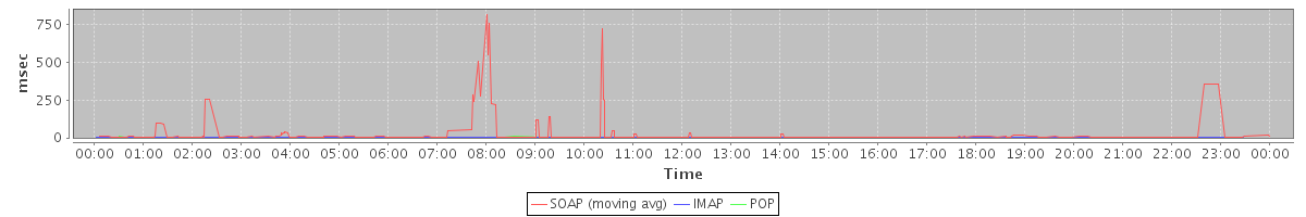 avg(BackupQueryRequest) = 549.40 avg(GetAggregateQuotaUsageOnServerRequest) = 1330.00 avg(GetFolderRequest) = 8.87 avg(SearchRequest) = 107.52 avg(BackupRequest) = 704.00 avg(GetFreeBusyRequest) = 670.15 avg(GetMiniCalRequest) = 55.00 avg(GetQuotaUsageRequest) = 1557.00 avg(AuthRequest) = 20.38 avg(SyncRequest) = 8.43