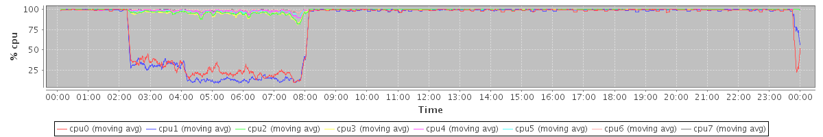 avg(cpu0) = 7.13 avg(cpu1) = 7.28 avg(cpu2) = 0.71 avg(cpu3) = 0.74 avg(cpu4) = 0.42 avg(cpu5) = 0.42 avg(cpu6) = 0.28 avg(cpu7) = 0.19