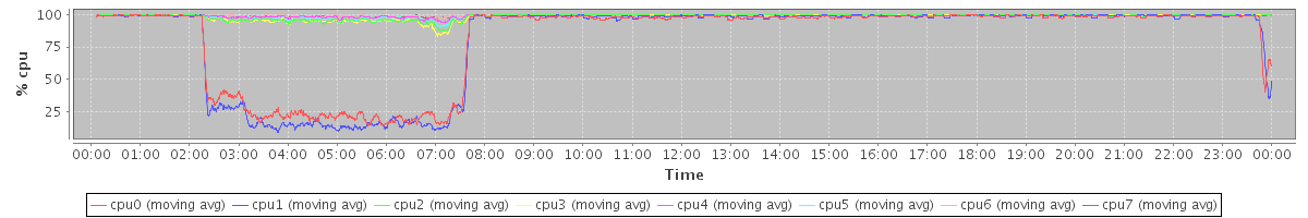 avg(cpu0) = 11.66 avg(cpu1) = 12.23 avg(cpu2) = 0.53 avg(cpu3) = 0.61 avg(cpu4) = 0.20 avg(cpu5) = 0.27 avg(cpu6) = 0.06 avg(cpu7) = 0.12