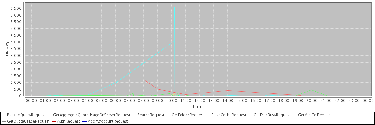 avg(BackupQueryRequest) = 441.60 avg(GetAggregateQuotaUsageOnServerRequest) = 849.00 avg(SearchRequest) = 19.05 avg(GetFolderRequest) = 6.79 avg(FlushCacheRequest) = 4.00 avg(GetFreeBusyRequest) = 117.98 avg(GetMiniCalRequest) = 31.00 avg(GetQuotaUsageRequest) = 1037.00 avg(AuthRequest) = 18.00 avg(ModifyAccountRequest) = 9.88