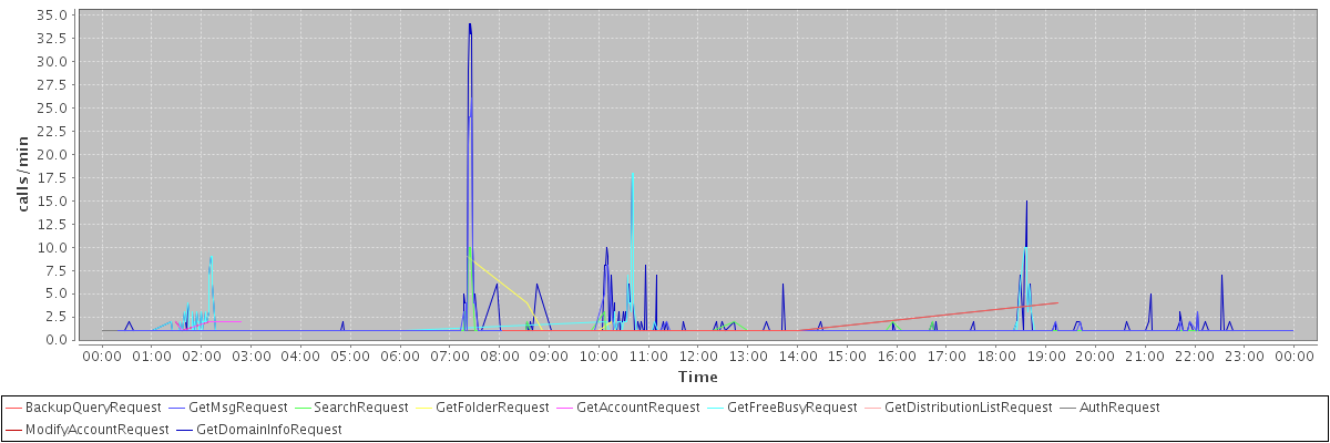 max(BackupQueryRequest) = 4.00 max(GetMsgRequest) = 26.00 max(SearchRequest) = 10.00 max(GetFolderRequest) = 9.00 max(GetAccountRequest) = 2.00 max(GetFreeBusyRequest) = 18.00 max(GetDistributionListRequest) = 1.00 max(AuthRequest) = 4.00 max(ModifyAccountRequest) = 2.00 max(GetDomainInfoRequest) = 34.00
