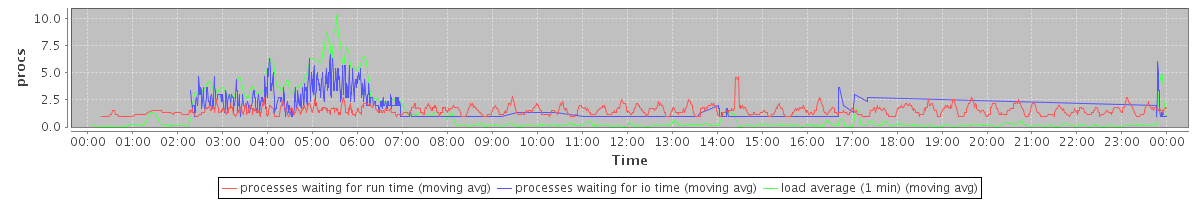avg(processes waiting for run time) = 0.71 avg(processes waiting for io time) = 0.58 avg(load average (1 min)) = 1.08