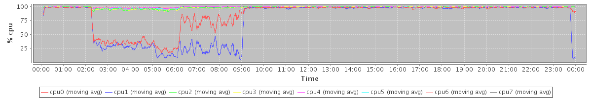 avg(cpu0) = 84.78 avg(cpu1) = 76.51 avg(cpu2) = 98.47 avg(cpu3) = 98.39 avg(cpu4) = 99.35 avg(cpu5) = 99.17 avg(cpu6) = 99.46 avg(cpu7) = 99.60
