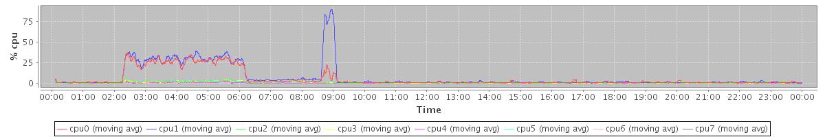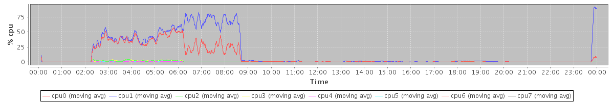 avg(cpu0) = 0.40 avg(cpu1) = 0.50 avg(cpu2) = 0.17 avg(cpu3) = 0.17 avg(cpu4) = 0.08 avg(cpu5) = 0.09 avg(cpu6) = 0.07 avg(cpu7) = 0.05