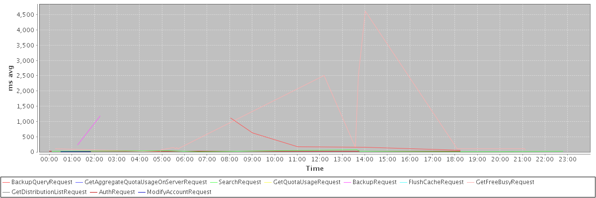 avg(BackupQueryRequest) = 422.60 avg(GetAggregateQuotaUsageOnServerRequest) = 1362.00 avg(SearchRequest) = 23.78 avg(GetQuotaUsageRequest) = 1752.00 avg(BackupRequest) = 706.50 avg(FlushCacheRequest) = 4.00 avg(GetFreeBusyRequest) = 688.62 avg(GetDistributionListRequest) = 2.50 avg(AuthRequest) = 19.88 avg(ModifyAccountRequest) = 9.00