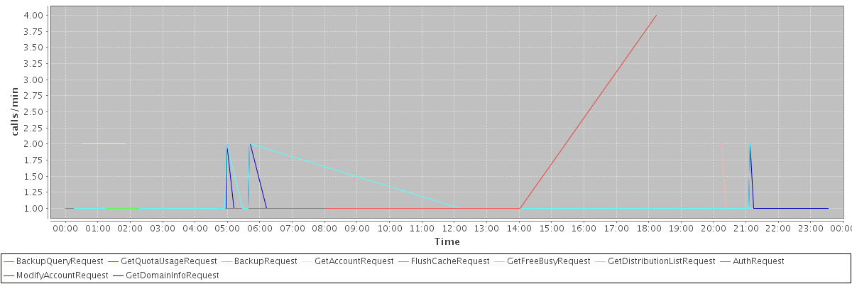 max(BackupQueryRequest) = 4.00 max(GetQuotaUsageRequest) = 1.00 max(BackupRequest) = 1.00 max(GetAccountRequest) = 2.00 max(FlushCacheRequest) = 1.00 max(GetFreeBusyRequest) = 2.00 max(GetDistributionListRequest) = 2.00 max(AuthRequest) = 4.00 max(ModifyAccountRequest) = 2.00 max(GetDomainInfoRequest) = 2.00