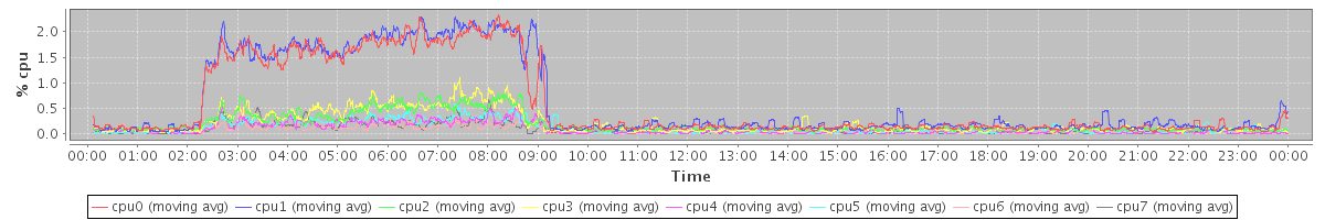 avg(cpu0) = 0.09 avg(cpu1) = 0.10 avg(cpu2) = 0.00 avg(cpu3) = 0.00 avg(cpu4) = 0.00 avg(cpu5) = 0.00 avg(cpu6) = 0.00 avg(cpu7) = 0.00