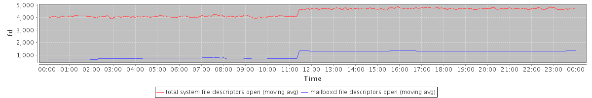 avg(total system file descriptors open) = 4423.78 avg(mailboxd file descriptors open) = 1039.73