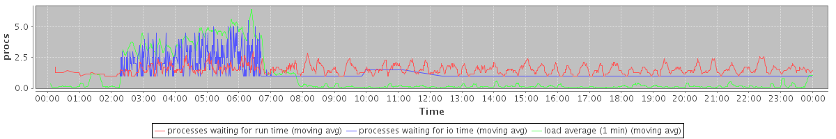 avg(processes waiting for run time) = 0.76 avg(processes waiting for io time) = 0.44 avg(load average (1 min)) = 0.93