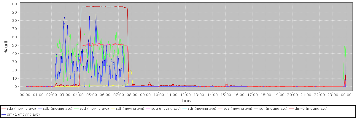 avg(sda) = 7.92 avg(sdb) = 5.82 avg(sdd) = 9.09 avg(sdf) = 0.44 avg(sdq) = 7.92 avg(sdr) = 5.82 avg(sds) = 9.09 avg(sdt) = 0.45 avg(dm-0) = 15.06 avg(dm-1) = 6.43