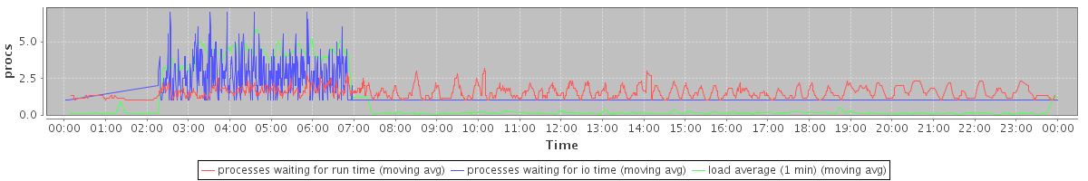 avg(processes waiting for run time) = 0.74 avg(processes waiting for io time) = 0.53 avg(load average (1 min)) = 0.93