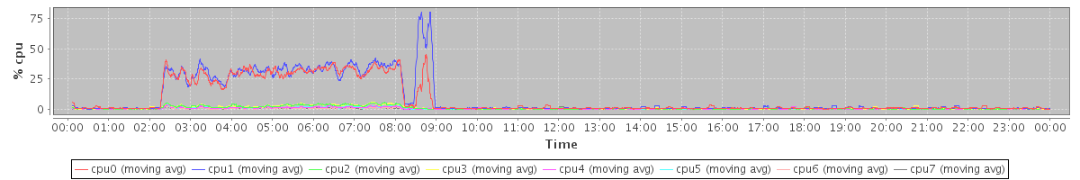 avg(cpu0) = 11.33 avg(cpu1) = 12.26 avg(cpu2) = 0.62 avg(cpu3) = 0.61 avg(cpu4) = 0.26 avg(cpu5) = 0.28 avg(cpu6) = 0.08 avg(cpu7) = 0.10