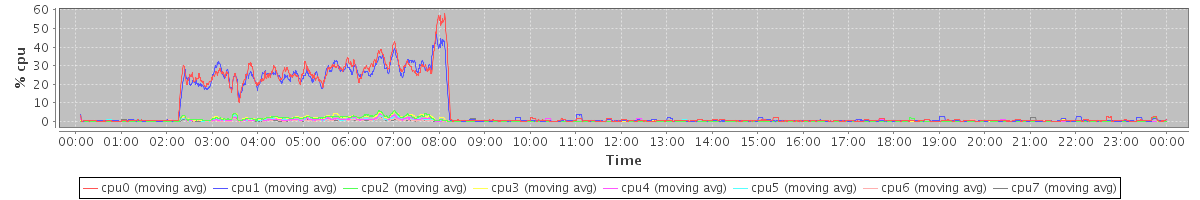 avg(cpu0) = 13.99 avg(cpu1) = 13.11 avg(cpu2) = 0.66 avg(cpu3) = 0.58 avg(cpu4) = 0.32 avg(cpu5) = 0.23 avg(cpu6) = 0.09 avg(cpu7) = 0.08