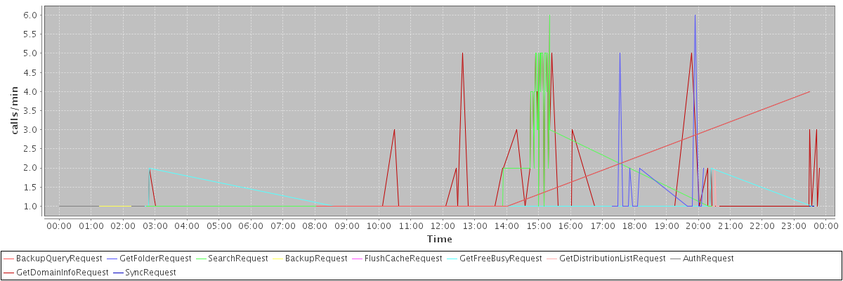 max(BackupQueryRequest) = 4.00 max(GetFolderRequest) = 6.00 max(SearchRequest) = 6.00 max(BackupRequest) = 1.00 max(FlushCacheRequest) = 1.00 max(GetFreeBusyRequest) = 2.00 max(GetDistributionListRequest) = 2.00 max(AuthRequest) = 4.00 max(GetDomainInfoRequest) = 6.00 max(SyncRequest) = 1.00