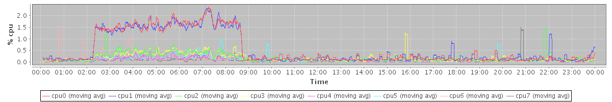 avg(cpu0) = 0.08 avg(cpu1) = 0.07 avg(cpu2) = 0.00 avg(cpu3) = 0.00 avg(cpu4) = 0.00 avg(cpu5) = 0.00 avg(cpu6) = 0.00 avg(cpu7) = 0.00