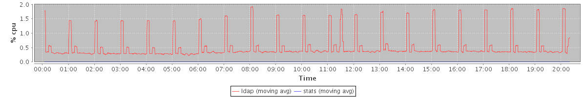 avg(slapd) = 115.67 avg(zmcontrol) = 5.18 avg(afs_rxevent) = 6.31 avg(syslogd) = 7.20 avg(zmbackupldap) = 5.00 avg(zmbackup) = 4.00 avg(puppetd) = 18.86 avg(slapcat) = 244.00 avg(zm-ldap-checkre) = 4.85 avg(java) = 23.63