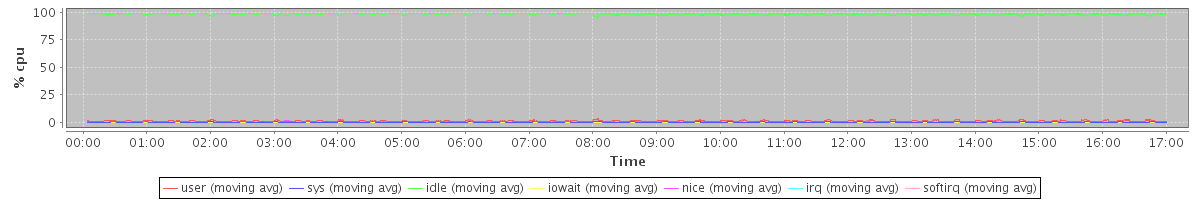 avg(user) = 1.22 avg(sys) = 0.25 avg(idle) = 98.17 avg(iowait) = 0.02 avg(nice) = 0.30 avg(irq) = 0.00 avg(softirq) = 0.00