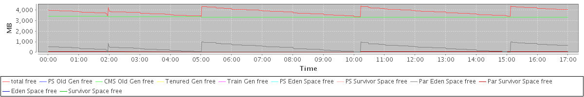 avg(total free) = 3845.91 avg(PS Old Gen free) = 0.00 avg(CMS Old Gen free) = 3350.39 avg(Tenured Gen free) = 0.00 avg(Train Gen free) = 0.00 avg(PS Eden Space free) = 0.00 avg(PS Survivor Space free) = 0.00 avg(Par Eden Space free) = 454.45 avg(Par Survivor Space free) = 41.07 avg(Eden Space free) = 0.00 avg(Survivor Space free) = 0.00