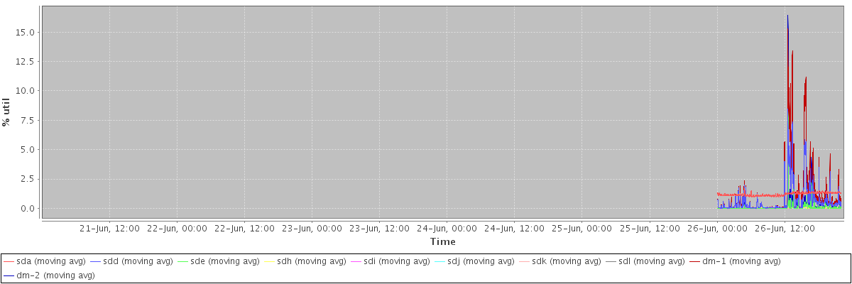 avg(sda) = 1.20 avg(sdd) = 0.70 avg(sde) = 0.13 avg(sdh) = 0.04 avg(sdi) = 0.04 avg(sdj) = 0.04 avg(sdk) = 0.04 avg(sdl) = 0.04 avg(dm-1) = 1.16 avg(dm-2) = 0.25