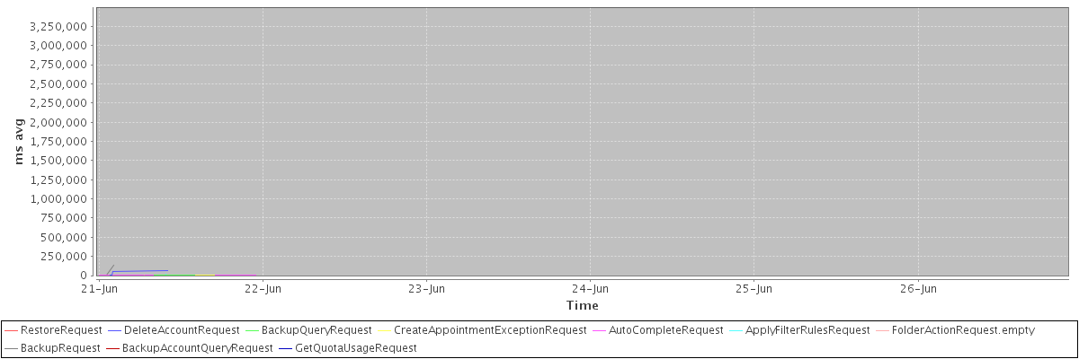 avg(RestoreRequest) = 3332442.00 avg(DeleteAccountRequest) = 30281.00 avg(BackupQueryRequest) = 904.86 avg(CreateAppointmentExceptionRequest) = 1044.00 avg(AutoCompleteRequest) = 748.31 avg(ApplyFilterRulesRequest) = 14421.50 avg(FolderActionRequest.empty) = 549.70 avg(BackupRequest) = 65180.00 avg(BackupAccountQueryRequest) = 577.00 avg(GetQuotaUsageRequest) = 1373.00