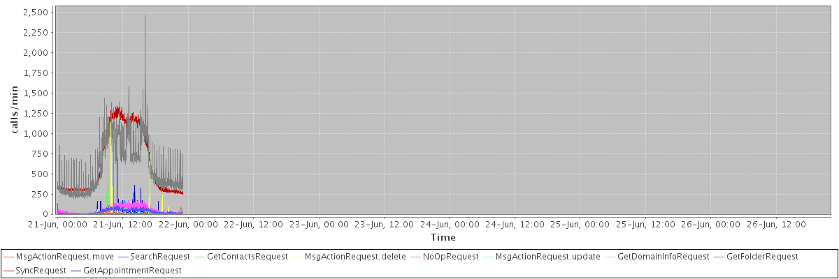 max(MsgActionRequest.move) = 1001.00 max(SearchRequest) = 137.00 max(GetContactsRequest) = 632.00 max(MsgActionRequest.delete) = 1137.00 max(NoOpRequest) = 171.00 max(MsgActionRequest.update) = 189.00 max(GetDomainInfoRequest) = 158.00 max(GetFolderRequest) = 2462.00 max(SyncRequest) = 1337.00 max(GetAppointmentRequest) = 1022.00