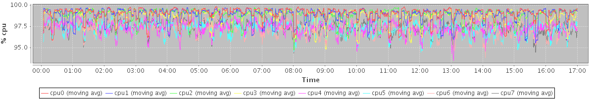 avg(cpu0) = 98.95 avg(cpu1) = 98.83 avg(cpu2) = 98.85 avg(cpu3) = 98.71 avg(cpu4) = 97.24 avg(cpu5) = 97.19 avg(cpu6) = 97.12 avg(cpu7) = 97.27