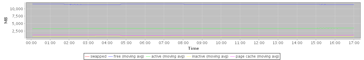 avg(swapped) = 0.00 avg(free) = 11506.56 avg(active) = 3394.88 avg(inactive) = 641.46 avg(page cache) = 1080.82