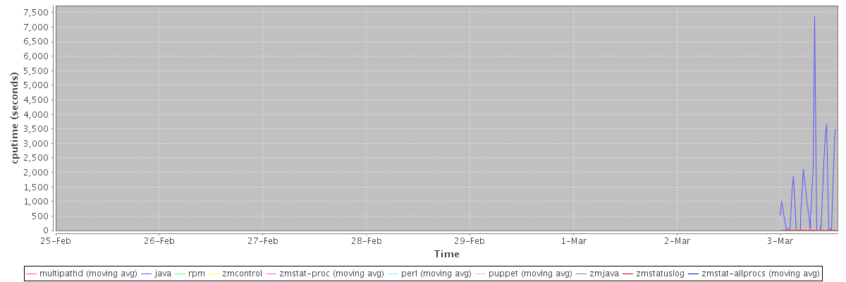 avg(multipathd) = 1.05 avg(java) = 812.00 avg(rpm) = 4.50 avg(zmcontrol) = 3.44 avg(zmstat-proc) = 0.84 avg(perl) = 1.93 avg(puppet) = 4.07 avg(zmjava) = 2.00 avg(zmstatuslog) = 1.32 avg(zmstat-allprocs) = 10.55