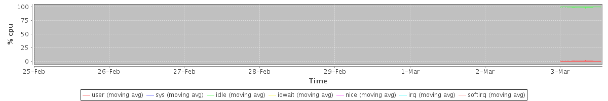avg(user) = 0.26 avg(sys) = 0.04 avg(idle) = 99.69 avg(iowait) = 0.00 avg(nice) = 0.00 avg(irq) = 0.00 avg(softirq) = 0.00