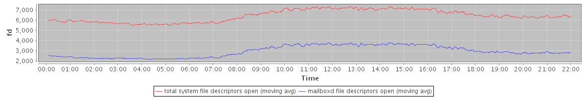 avg(total system file descriptors open) = 6426.58 avg(mailboxd file descriptors open) = 2912.06