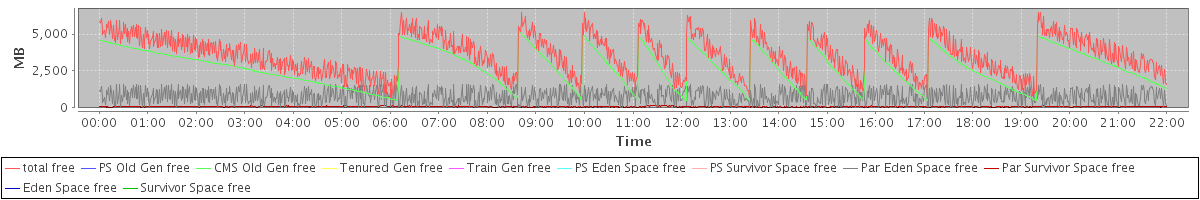 avg(total free) = 3591.81 avg(PS Old Gen free) = 0.00 avg(CMS Old Gen free) = 2728.28 avg(Tenured Gen free) = 0.00 avg(Train Gen free) = 0.00 avg(PS Eden Space free) = 0.00 avg(PS Survivor Space free) = 0.00 avg(Par Eden Space free) = 782.57 avg(Par Survivor Space free) = 80.96 avg(Eden Space free) = 0.00 avg(Survivor Space free) = 0.00