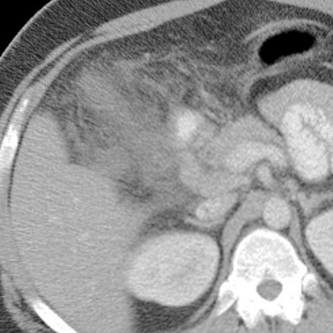 67-year-old diabetic male with a long history of colicky RUQ pain presents with a sudden onset of increased abdominal pain. [2 of 2]