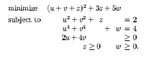 For the objective, we define the function f(u, v, z) = (u + v + z)2 to include only the nonlinear terms. The variables x' = (u, v, z) are known as nonlinear objective variables, and their dimension is specified by the snopt input parameter nnObj (= 3 here). The linear part 3z + 5w of the objective is treated as an additional linear constraint whose row index is specified by the input parameter iObj (= 3 or 4 here). Thus, the full objective has the form