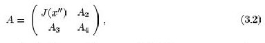 where x'' is the first nnJac variables, F(x'') is defined by subroutine funcon, and y'' contains the remaining variables. The full Jacobian is of the form