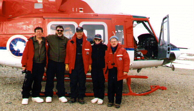 Posing before the helicopter that would take us to meet Dr.Ralph Harvey's team of meteorite searchers -- from left to right: Dr. Neal Sullivan, Director, Office of Polar Programs, NSF; me; US Navy pilot; Mrs. Julia Moore, Director, Office of Legislative and Public Affairs, NSF; and another US Navy pilot.