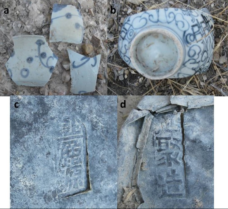 Figure 14. Artifacts identified at 42BO541: a. Bamboo-pattern semi-porcelain pottery sherds; b. Double Happiness-pattern semi-porcelain bowl base; c. Source of Beauty (lí yuan) brand opium can cartouche; d. possible Abundant Luck (fú long) brand opium can cartouche. From Cannon, et al 2016.