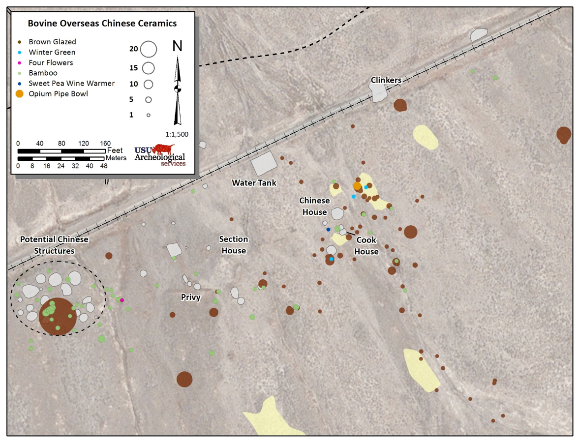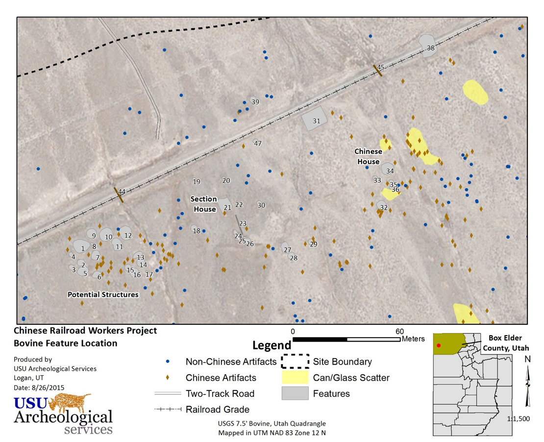 To supplement the historical record, USUAS completed detailed documentation of two section stations and the town site of Terrace, along the route of the original transcontinental railroad in Box Elder County.35 The two stations, Ombey and Bovine, and the town site of Terrace are now on lands managed and administered by the Salt Lake Field Office of the Bureau of Land Management. For the two section stations, archaeologists carefully identified, counted, and mapped the location of all features (foundations, trash dumps, and other features) and those artifacts generally identified as ethnically Chinese (Figure 17). Terrace, however, is a much larger site spread over several hundred acres. As such, archaeologists focused on documenting those portions of the site near the previously identified Chinatown. When in their original context, artifacts can provide a wealth of information on the site’s ethnic makeup, spatial organization of housing and people, wealth and status, and a host of other important topics. In this case, the artifacts can provide a snapshot of the daily activities of Chinese railroad workers in the last few decades of the 1800s through about 1920. Combine this with the section station drawings found in Central Pacific, Salt Lake Division, 1880, and there is a great opportunity to understand the life of those in these areas in rural Nevada and Utah.