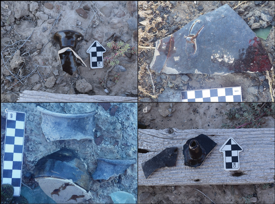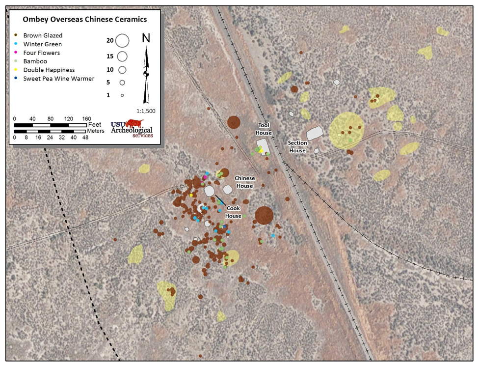 As expected, the surface of Ombey contains thousands of artifacts, including numerous cans, ceramics, bottles, railroad hardware, and domestic items. Chinese artifacts are scattered across the site but also appear concentrated near the China House and nearby depression features. Chinese overseas material culture includes semi-porcelain ware (Bamboo Double Happiness patterns), brown-glazed stoneware (widemouthed jars, large storage jars, liquor bottles, and spouted jars), Winter Greenreen (celadon), opium tins, an opium lamp, and other artifact types.