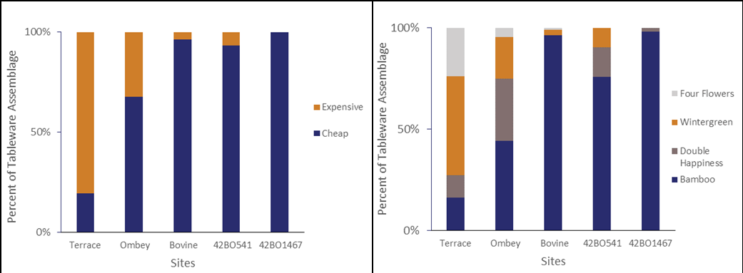 The ceramic assemblage at Terrace included much higher frequencies of expensive tableware (Winter Green and Four Seasons patterns), which accounts for 80% of the assemblage. Compare this to the lower cost Bamboo and Double Happiness styles, which represent the remaining 19.5% of the assemblage. Terrace greatly differs from the other sites, as the relative dominance of expensive ceramics was approached only by the Ombey assemblage, where the same types represent only 42.4% of the assemblage. Within the expensive ceramics, a high number of vessel styles was also present.