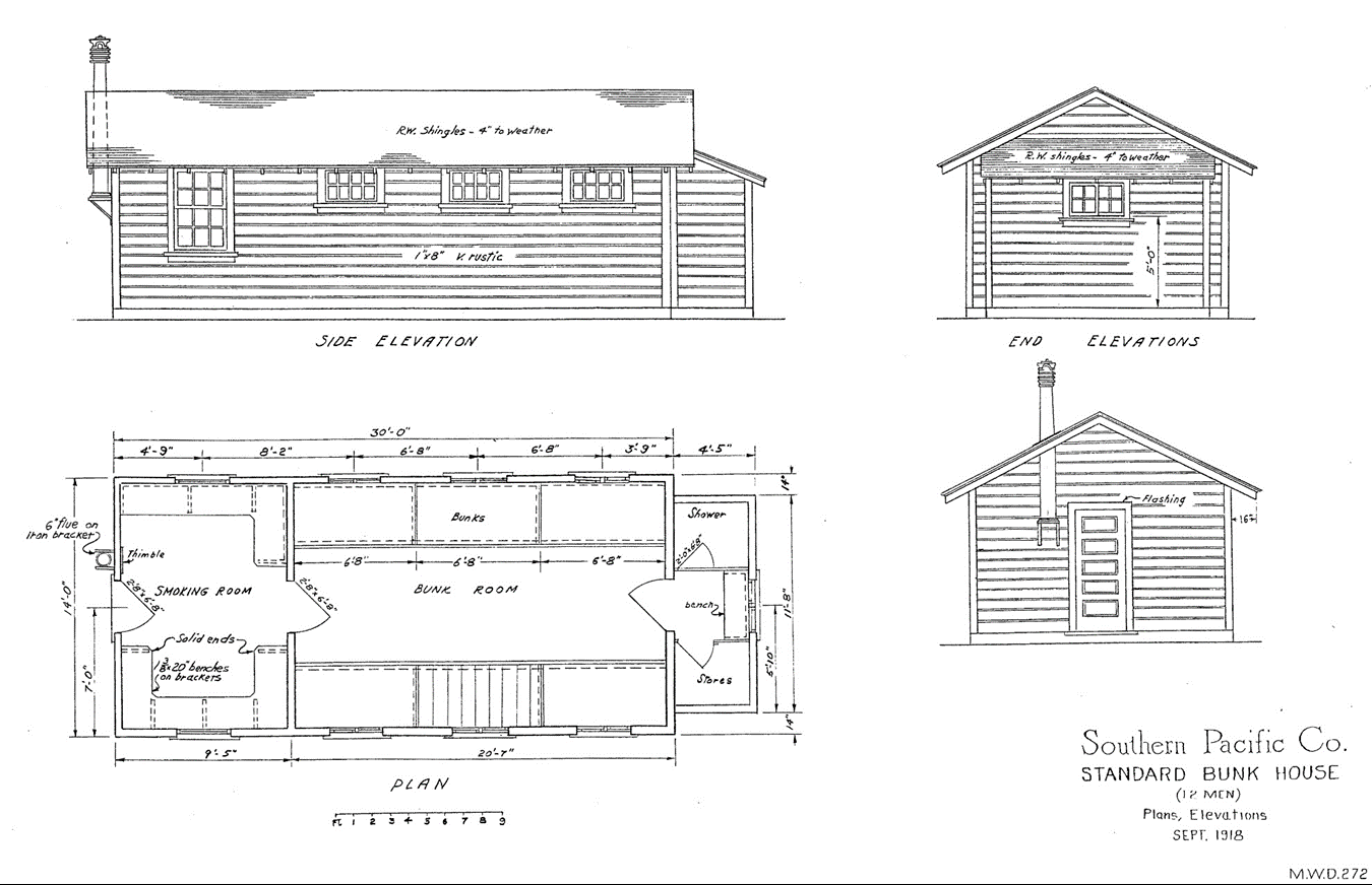 Perhaps the most interesting aspect of the sites are the plan layouts and configuration of features. As shown in the plan drawings for most of these stations, the Chinese bunk houses and cookhouses are always segregated, well away from the section house, which is where the foremen (usually two American or Euro-American men) for the station lived and office work was carried out. In some cases the Chinese occupation areas are more than 500 feet distant and often across the railroad tracks (Figure 16). This configuration was archaeologically confirmed repeatedly during surveys of the sites., There were few locations where this would have been due to topographic variability or lack of suitable land on which to build. There was an obvious interest in keeping distance between the white foremen and the Chinese laborers.