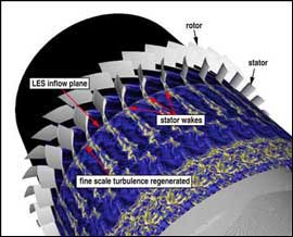 Integrated RANS-LES of the NASA stage 35 compressor and a diffuser: the compressor stage is computed with the RANS flow solver TFLO, the subsequent diffuser with the LES flow solver CDP. Here we see the axial velocity component at the 50% plane of the stator. The clip plane hides the diverging wall of the diffuser in the LES domain. At the interface, the turbulence that has been predicted in the RANS flow solver with a turbulence model has to be regenerated in the LES solution. Most prominent feature of the coupled simulation is the migration of the stator wakes into the LES domain.