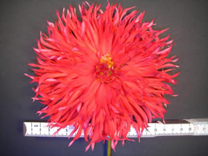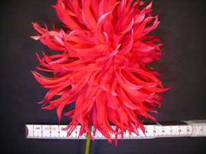 This cultivar is laciniated cactus type, red in color, and of size A. It was grown, named, introduced and registered in 2003 by Mrs. E. Fenton. It is derived from seed sent from Mr. C.O. Higgo in South Africa, and is of unknown parentage.