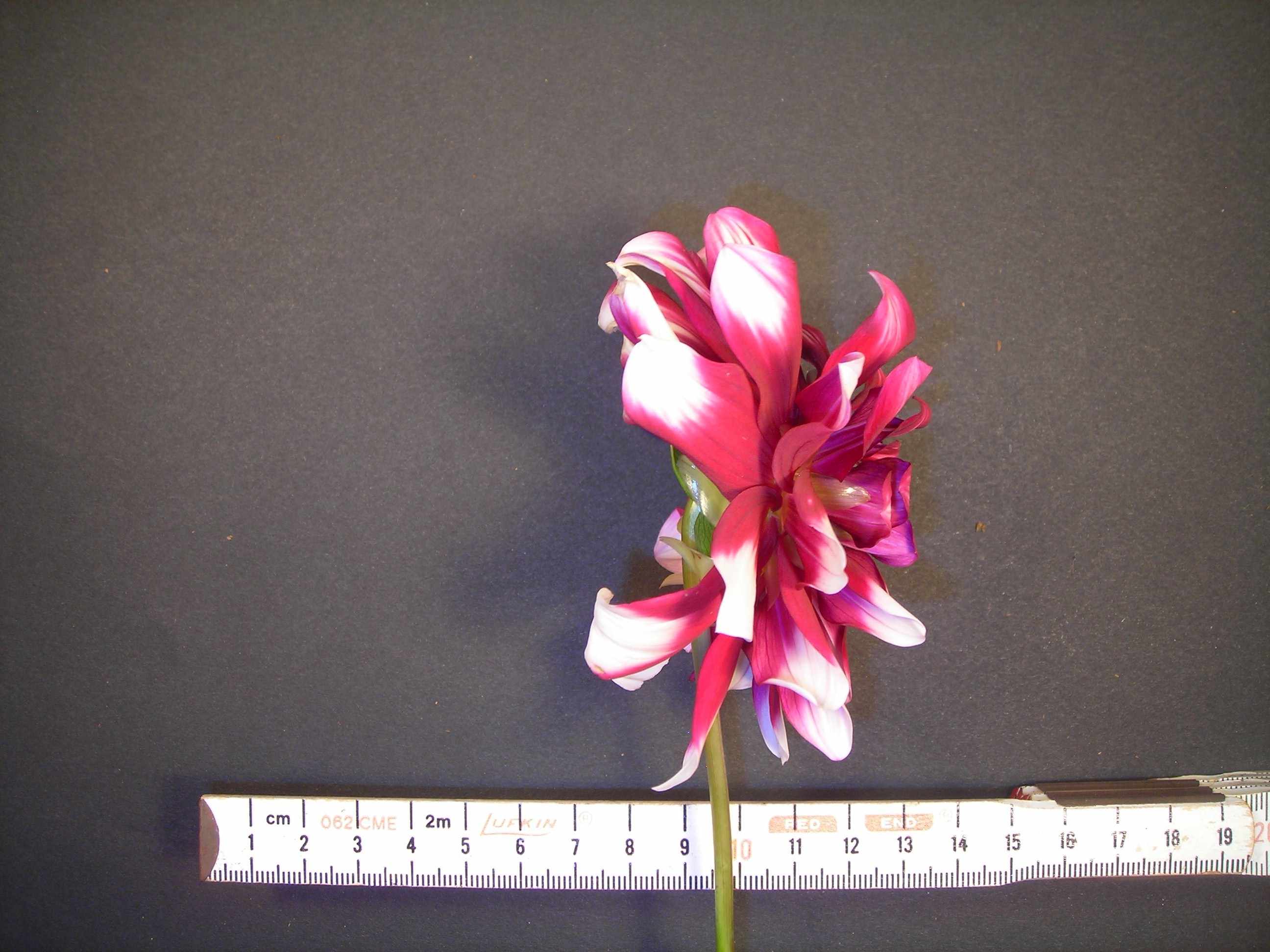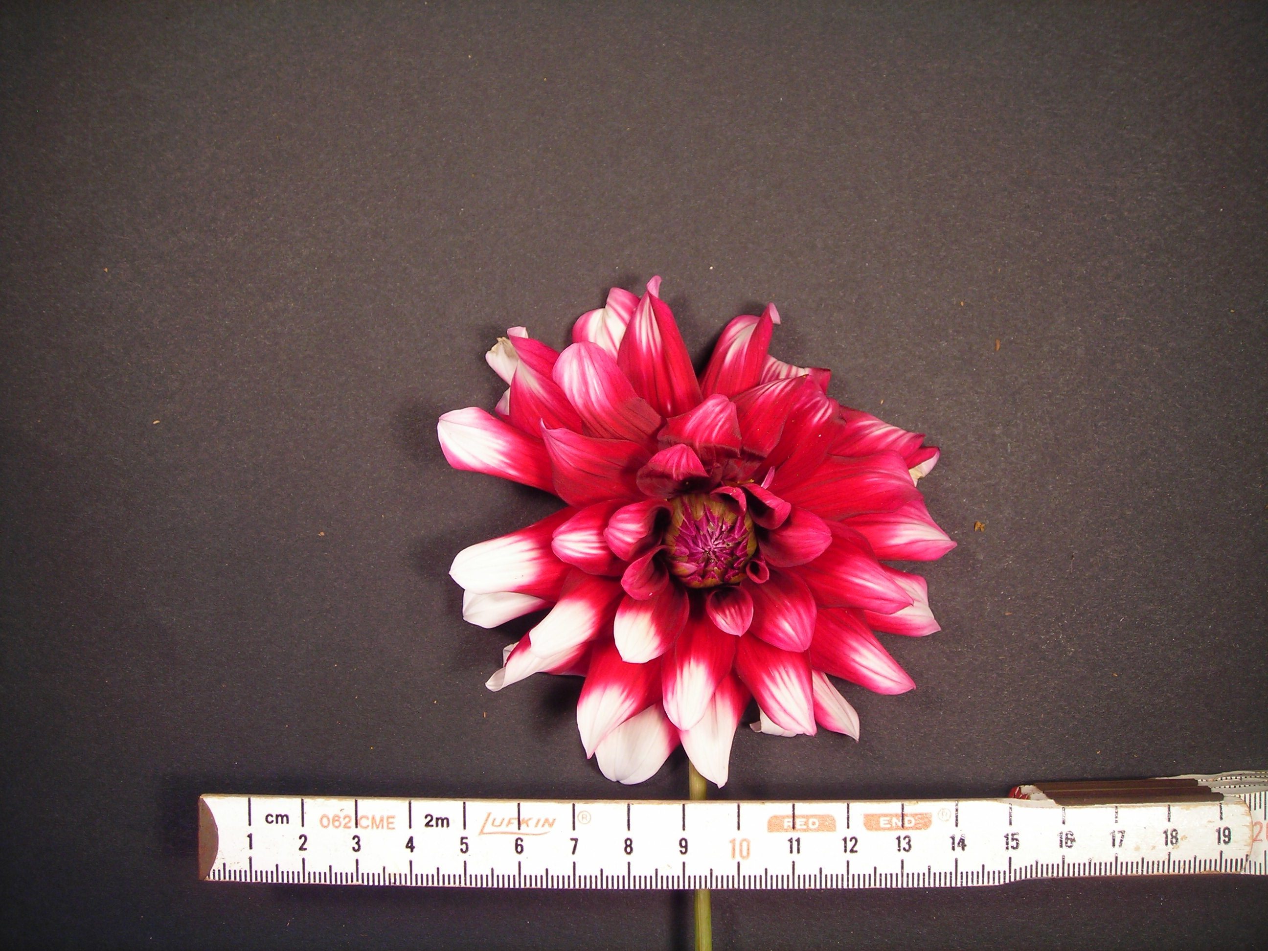 This cultivar is formal decorative type, bicolor red and white, and of size B. It was registered in 1955 by Scott, Bremerton, Washington.