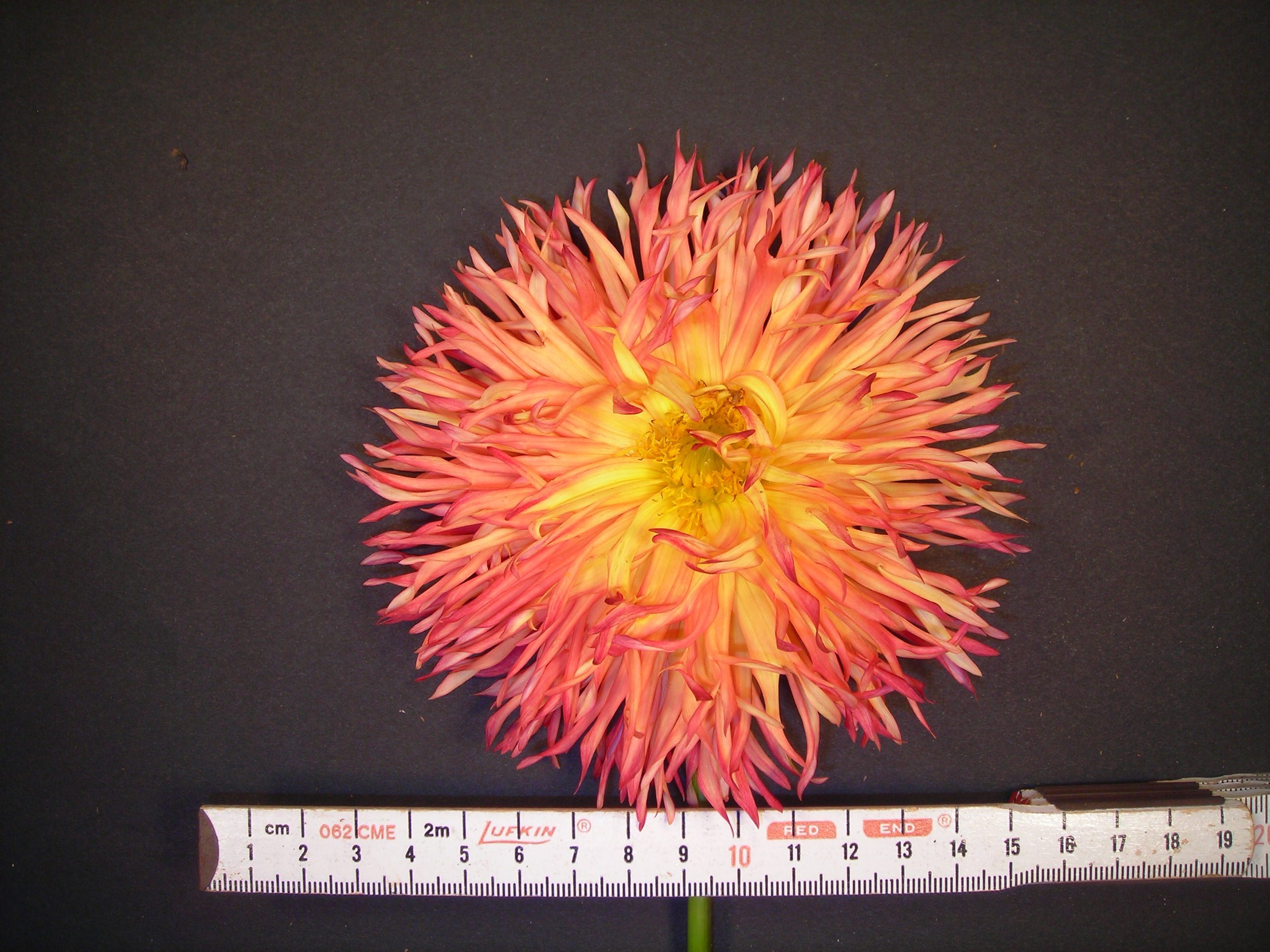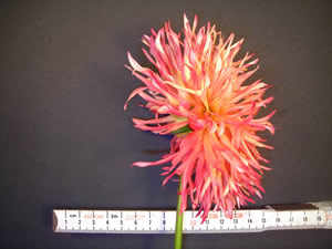 This cultivar is laciniated cactus type, flame blend in color, and of size A. It was grown, named and registered in 2004 by D. Walker, Borehamwood, Hertfordshire, England. It is derived from seed sent from Mr. C.O. Higgo in South Africa, and is of unknown parentage.