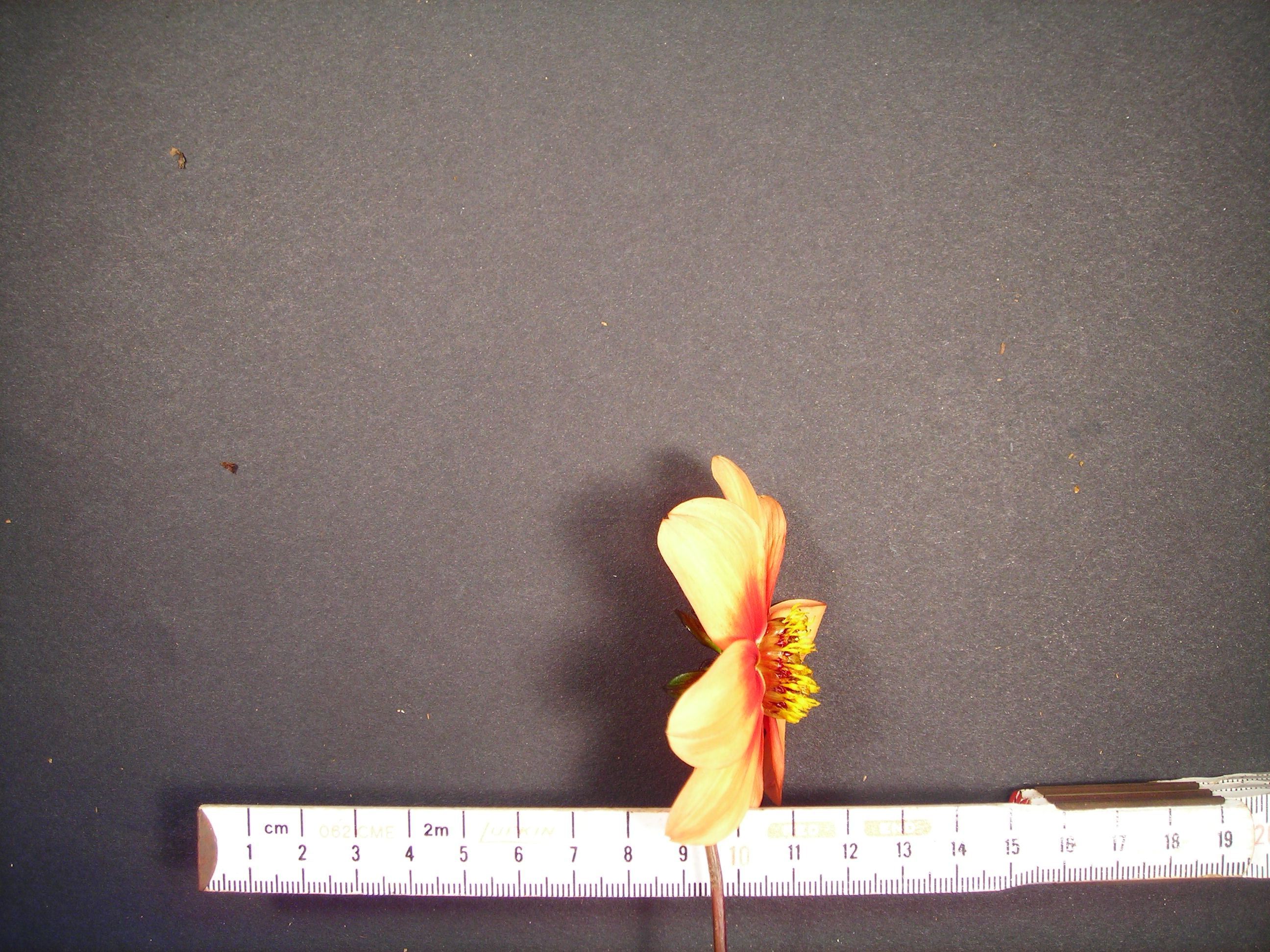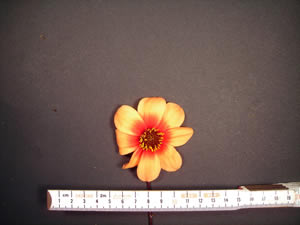 This cultivar is single type, bicolored red and orange, and of size M. It was hybridized in The Netherlands, grown and named in 1990 by Chris Sanders of Bridgemere Nurseries, UK, and registered in 2001 by the International Cultivar Registration Authority, Royal Horticultural Society’s Garden,