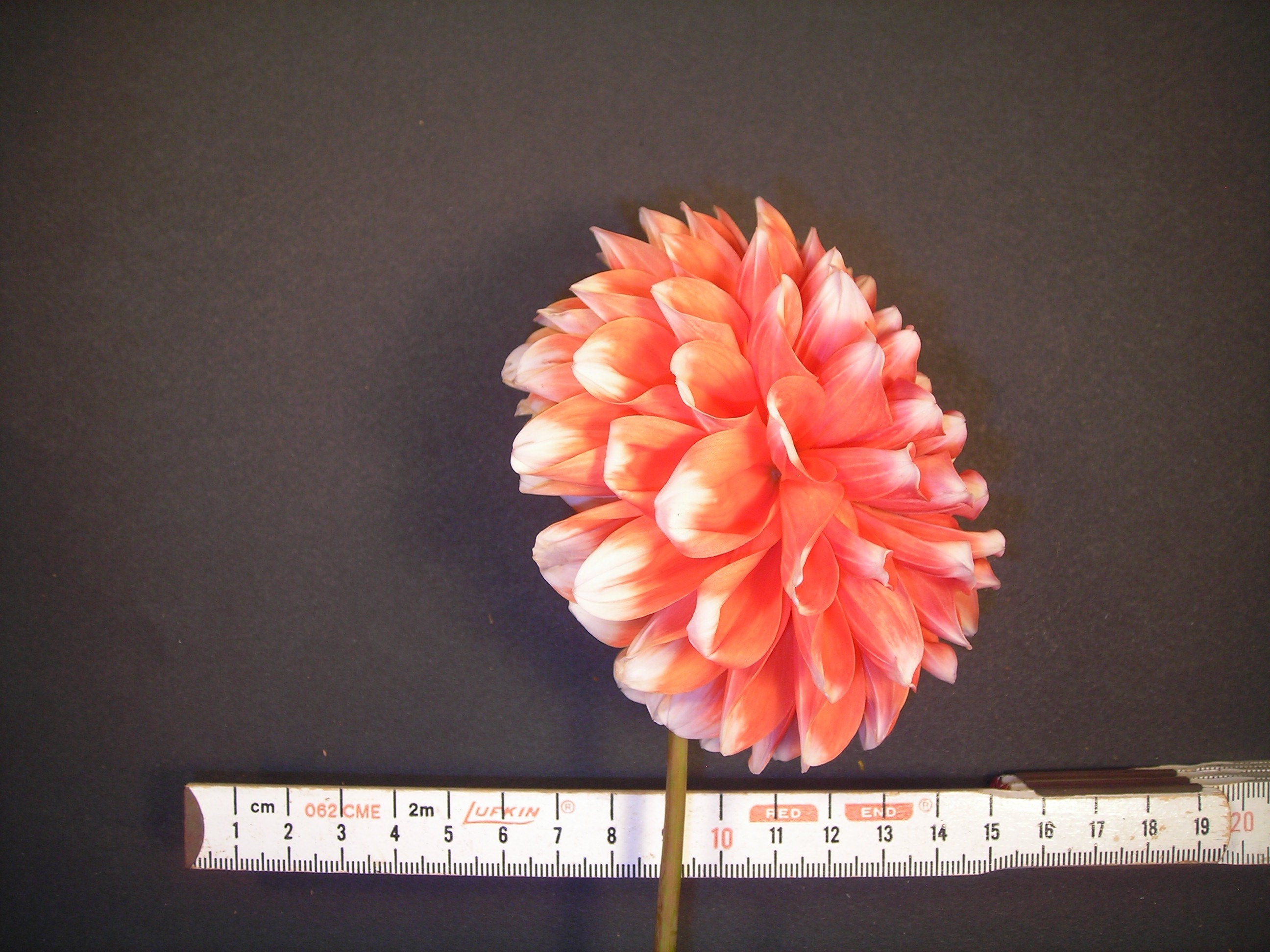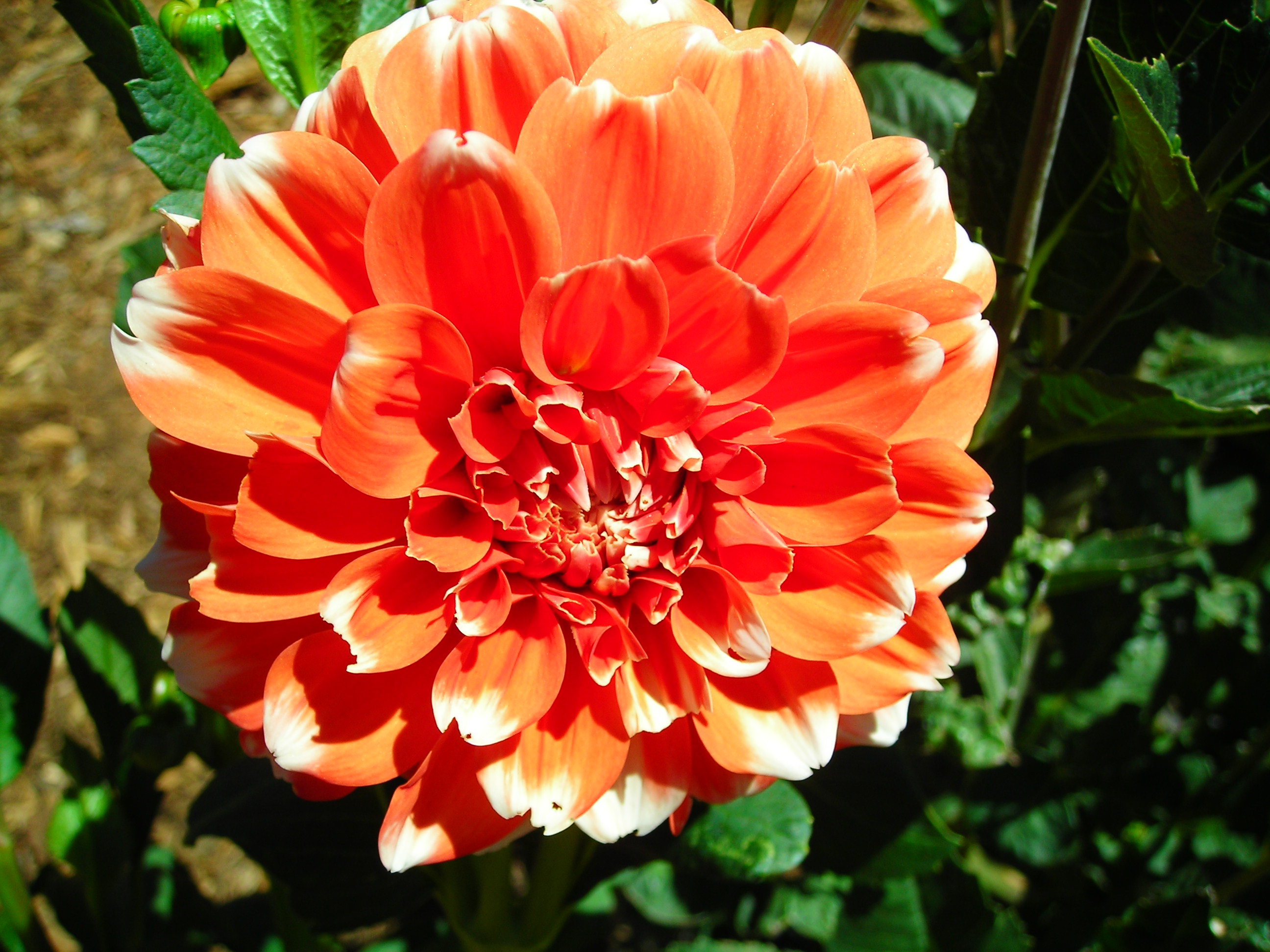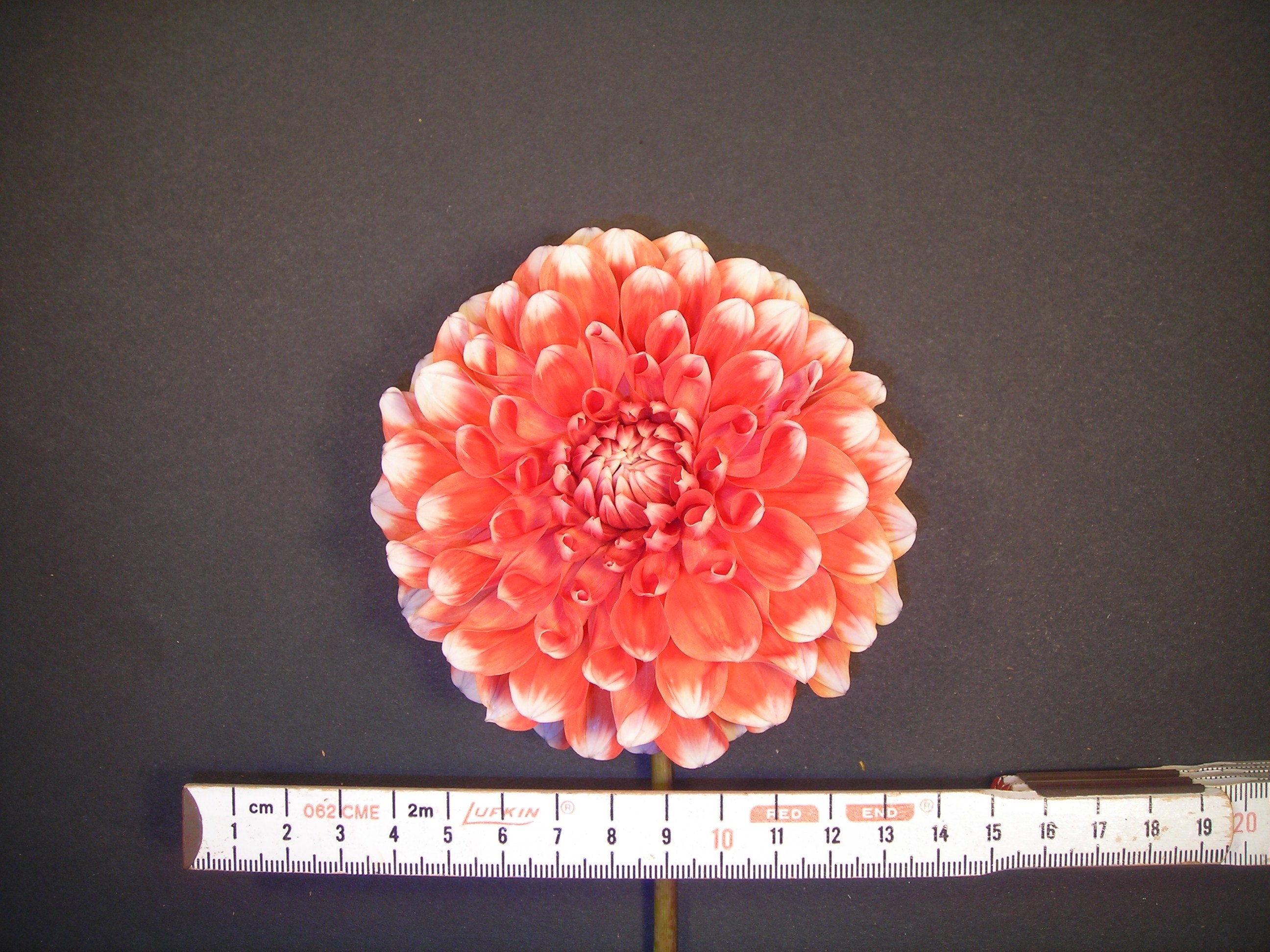 This cultivar is formal decorative type, bicolored orange and white, and of size BB. It was registered in 2000 by an unknown registrant.