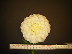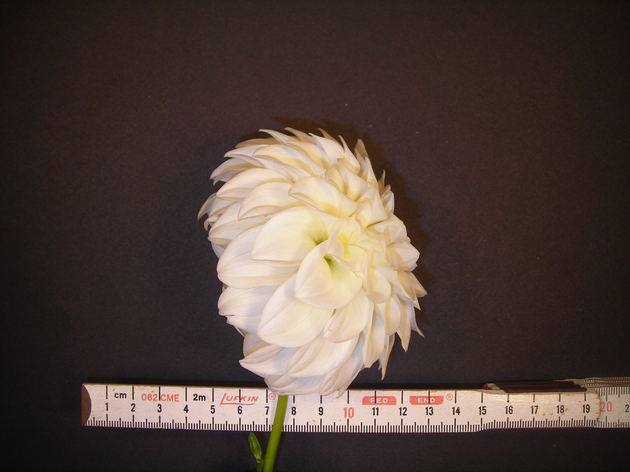 This cultivar is formal decorative type, white in color, and of size BB. It was registered in 1953 by C.F. Pape, Carpenteria, Santa Barbara, California.
