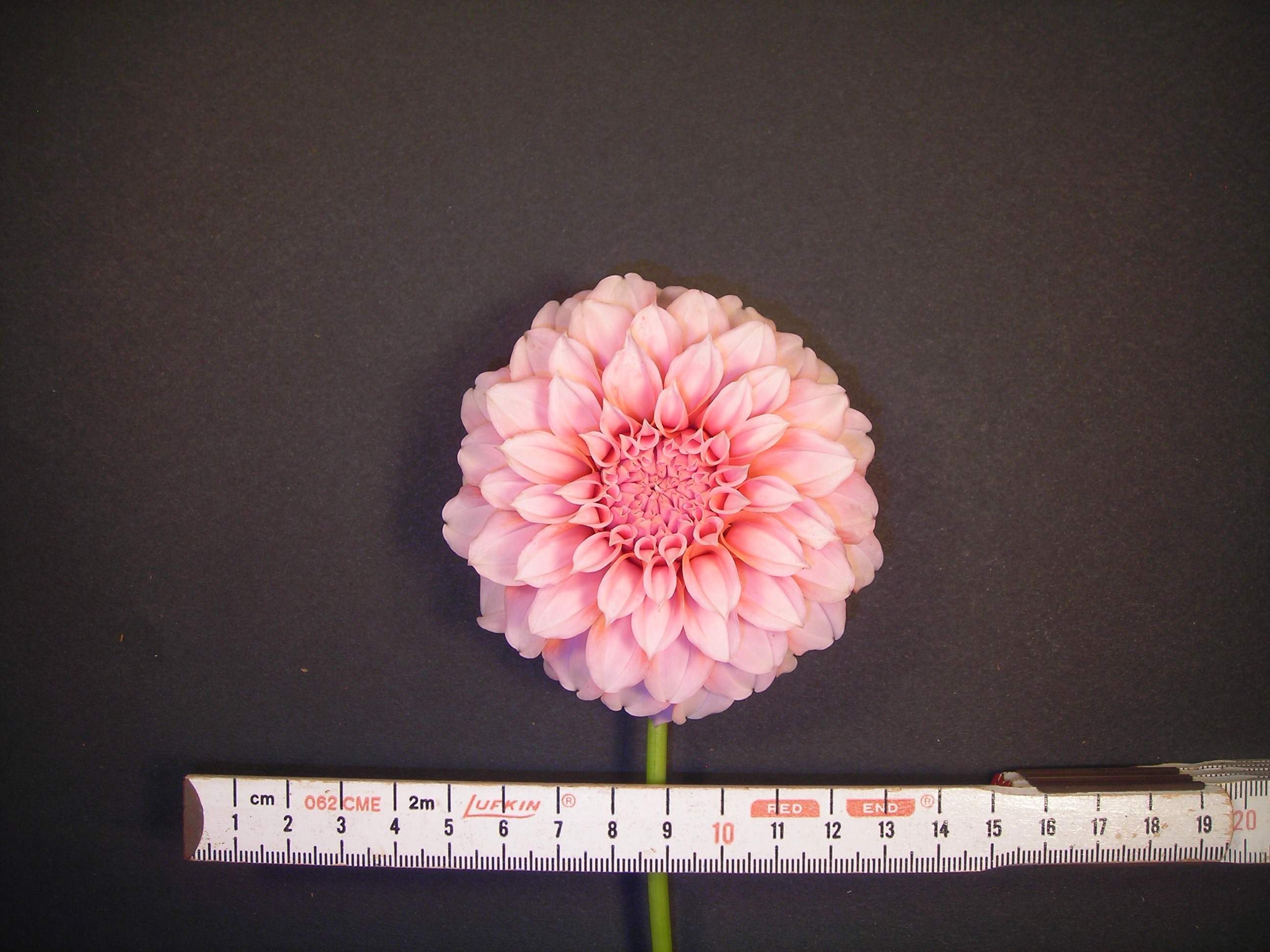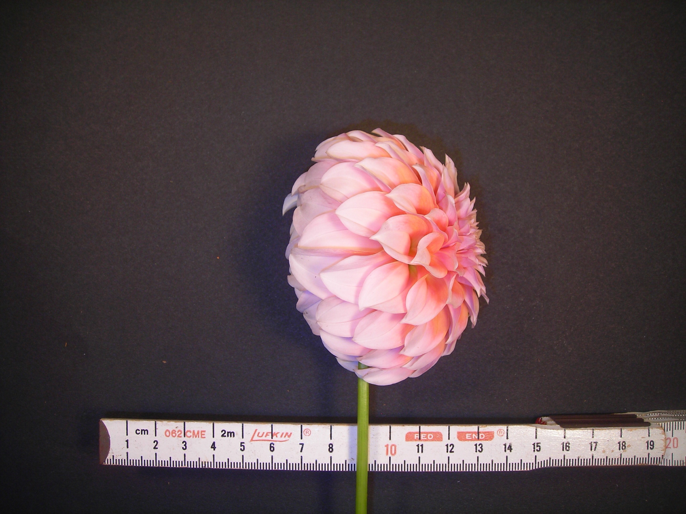 This cultivar is formal decorative type, light blend in color, and of size M. It was hybridized and grown in 1994 by R.J. Muntjewerff, Middenbeemster, The Netherlands, named in 2000 by