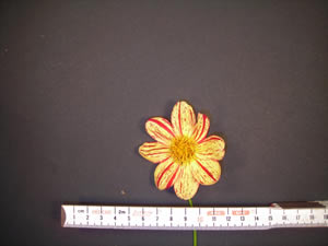 This cultivar is single type, variegated red and yellow, and of size M. IIt was registered in 2006 by Kevin Larkin of Corralitos Gardens, Corralitos, California.